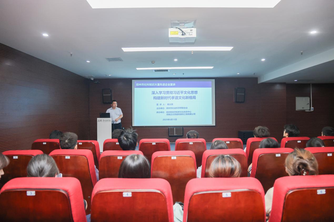 为做好社科普及宣讲工作,持续开展习近平新时代中国特色社会主义思想和党的二十大精神的进基层宣讲活动,贯彻落实全国、省、市宣传思想文化工作会议精神,6月12日上午,由郑州市社会科学界联合会主办,郑州财经学院孝文化传承中心与河南正众贤建筑装饰工程有限公司联合承办“深入学习贯彻习近平文化思想 构建新时代孝道文化新格局”为主题的宣讲活动,在承办企业举办。校党委宣传部部长杨建伟、机关二党总支书记时健、17cc.cm处长陈明灿、河南正众贤建筑装饰有限公司总经理徐志春及公司20余名职工参加宣讲活动,活动由徐志春主持。